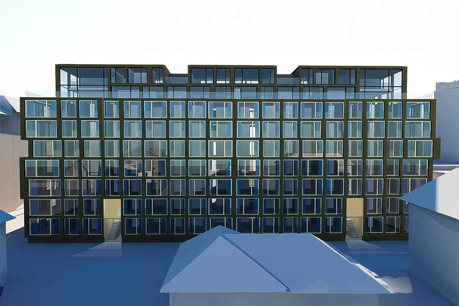 Extrait du texte de présentation - Les façades rue sont largement vitrées pour profiter de la lumière naturelle, tandis que la façade cour est dotée de coursives servant également de terrasses. Deux cages d'escaliers traversantes et lumineuses assurent la distribution verticale. En raison de l'orientation, des appartements traversants ont été privilégiés, avec des chambres parentales s'ouvrant sur les espaces de vie. Les chambres pour enfants ou bureau sont situées vers les coursives. L'objectif est de créer un habitat contemporain, lumineux et fonctionnels respectant les contraintes d'orientation et d'alignement pour offrir un cadre de vie agréable.